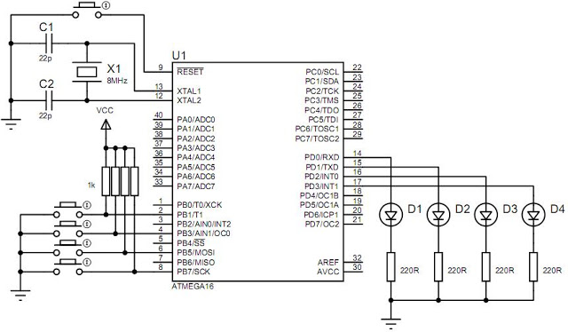 El ATmega16 cuenta con 4 puertos de entrada/salida (A,B,C,D), estos puertos se controlan mediante los siguientes registros: