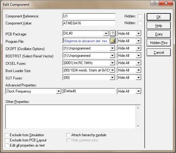 Haciendo doble clic sobre el uC nos sale una ventana como esta y elegimos la ubicación del archivo .hex: