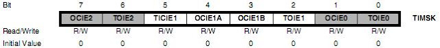 TIMSK: Registro encargado de la habilitación de las interrupciones, TICEI1 habilita la interrupción de captura de entrada, OCIE1A habilita la interrupción por igualdad en la comparación de salida A, OCIE1B habilita la interrupción por igualdad en la comparación de salida B, TOIE1 habilita la interrupción por desbordamiento.