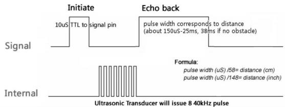 Si un pulso de 10us de ancho es enviado al pin trigger, el ultrasonido enviará ocho señales de 40 KHz y detectará el eco. La medida de la distancia es proporcional al ancho de pulso del eco que puede ser calculado por fórmula. Si ningún obstáculo es detectado, el pulso que se generará será de 38 ms.